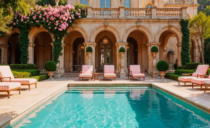 When selecting poolside furniture, think comfort and classic appeal. Wicker, teak, and wrought iron are all strong choices that align with the French country aesthetic. Opt for lounge chairs with plush cushions in linen, toile, or faded floral patterns. Neutral tones work well, but don’t be afraid to introduce subtle touches of sage green or dusty lavender. A few antique-style urns, distressed planters, or vintage-inspired lanterns can complete the look without feeling forced.
